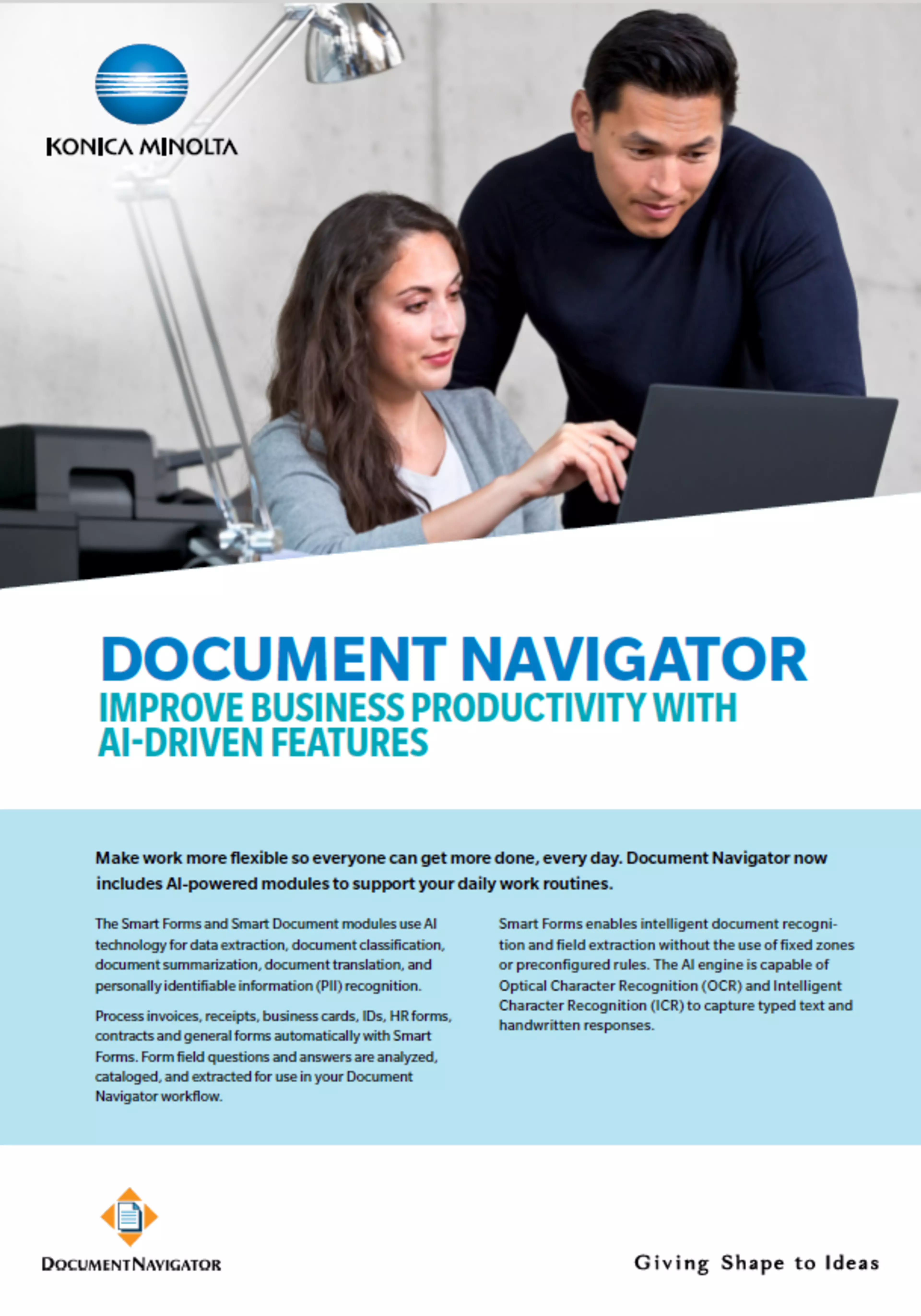 Offering intelligent document capture, processing and delivery, the Konica Minolta Document Navigator provides seamless electronic workflows for paper-based documents. This simple and flexible capture solution manages document-based processes easily and with absolute reliability, letting office workers concentrate on the essentials of their business.